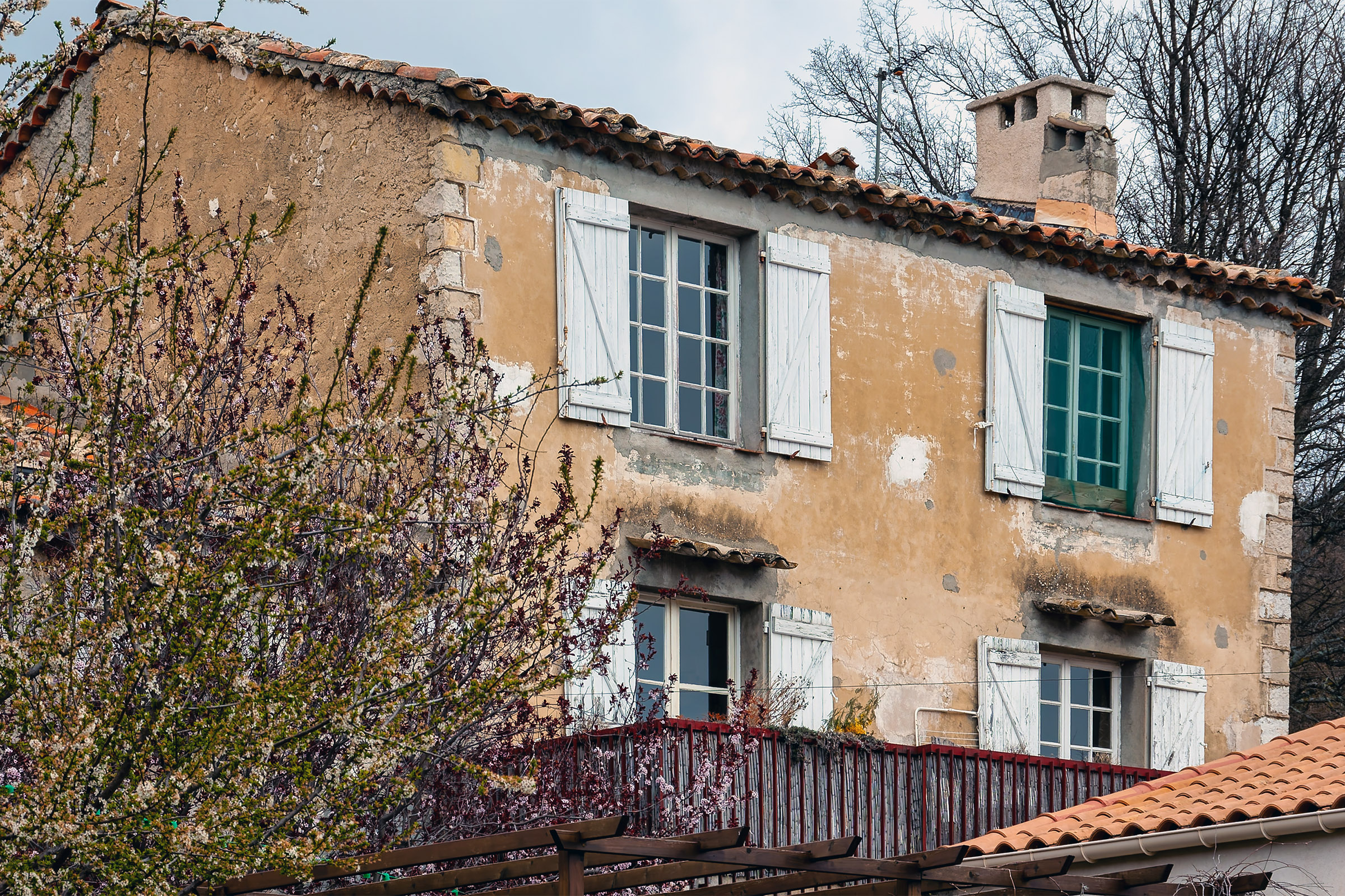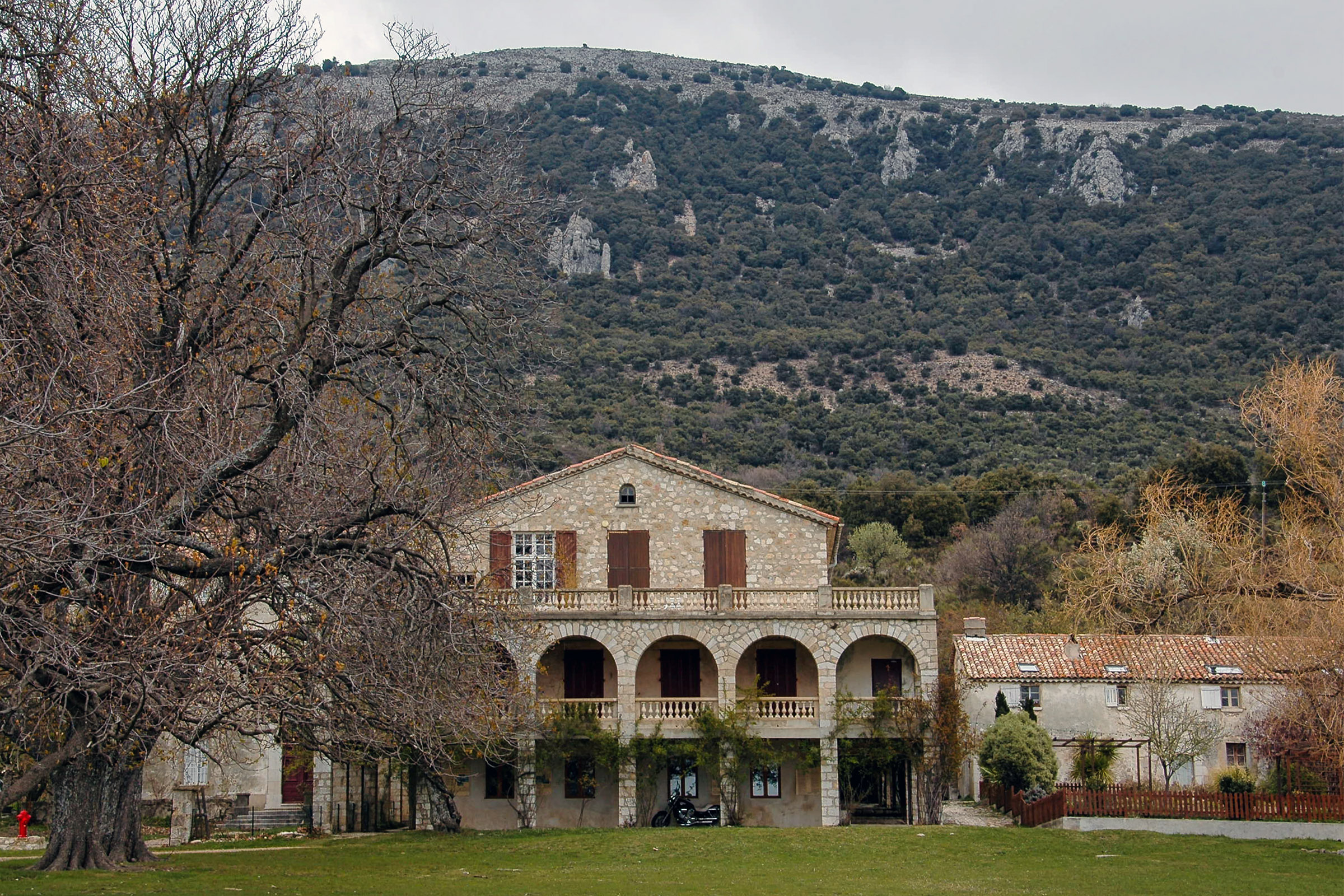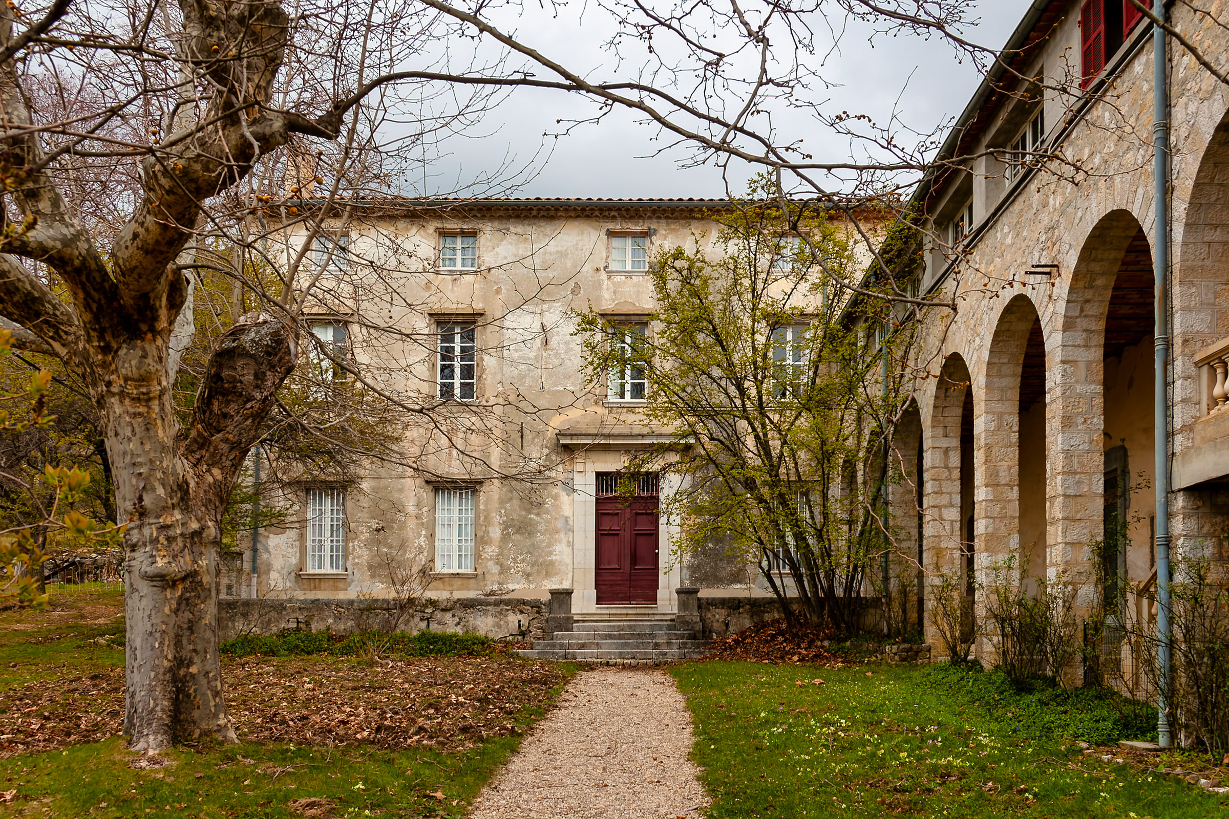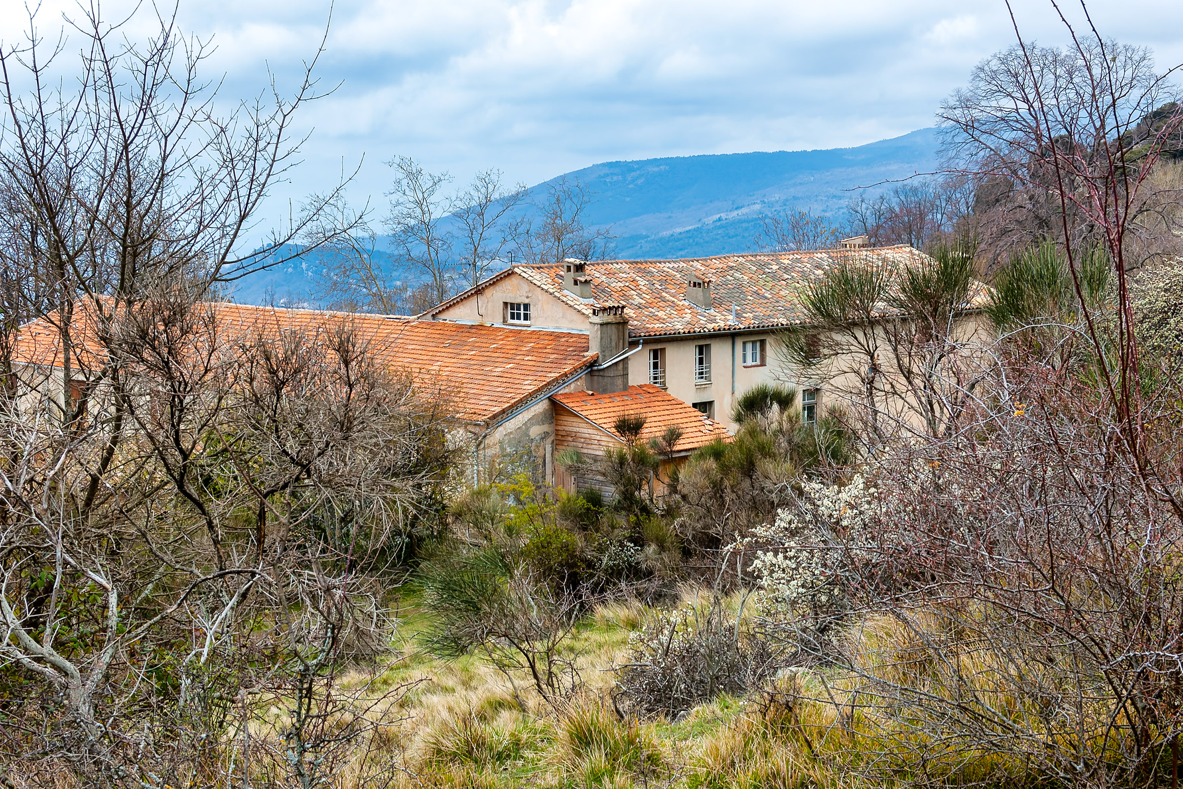 The Domaine de Courmettes was originally a sanatorium; it is located on land that is part of the village of Tourrettes-sur-Loup and belongs to the Association Amiral de Coligny. More recently, it has been used as a retreat, a conference center, and a vacation camp. At this time (April 2007) the complex is closed; several projects are being evaluated to see to what use the Domaine de Courmettes may be put in the future. Because the purpose of the Asociation Amiral de Coligny is to combat tuberculosis, it is not impossible that the domain will become associated with health care again. Another possibility is to make it a training center for environmentalists as the buildings are situated amid a nature preserve of some 600 hectares (roughly 1,500 acres). If I become aware of updates to this, I will post them in this space. The photos on this page were taken on Saturday, March 31, 2007 and reprocessed from the original raw files in November of 2015.
