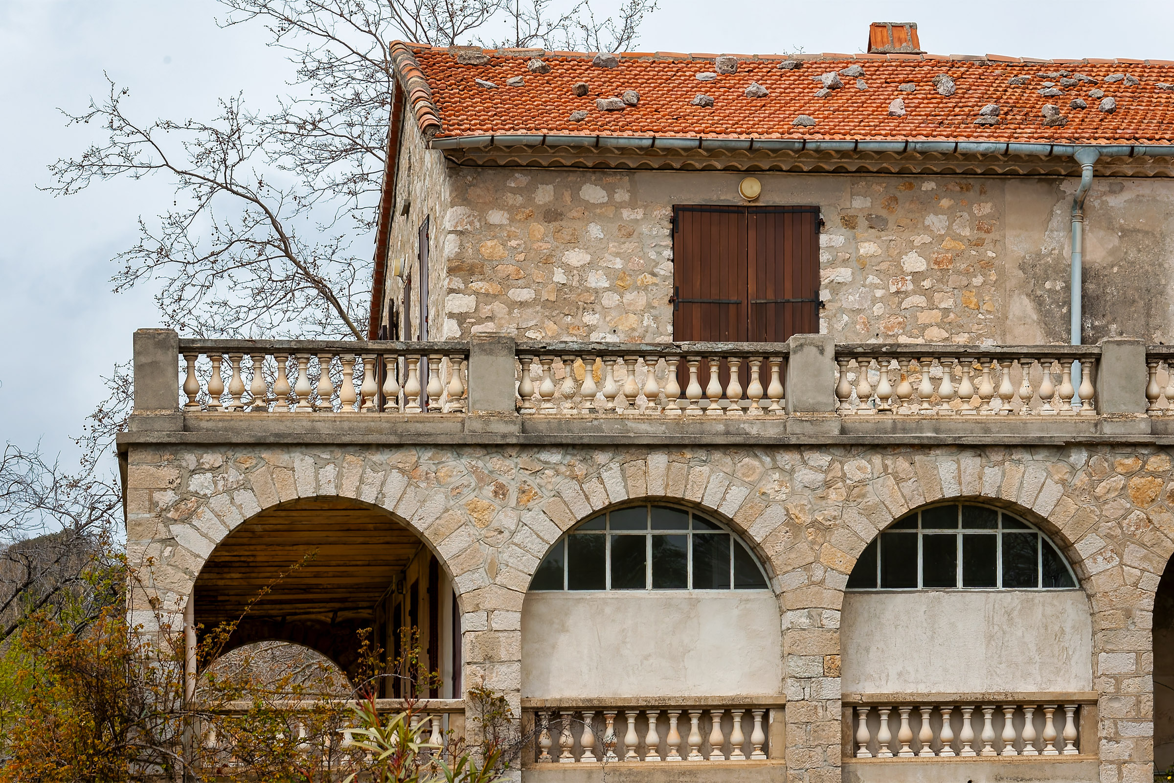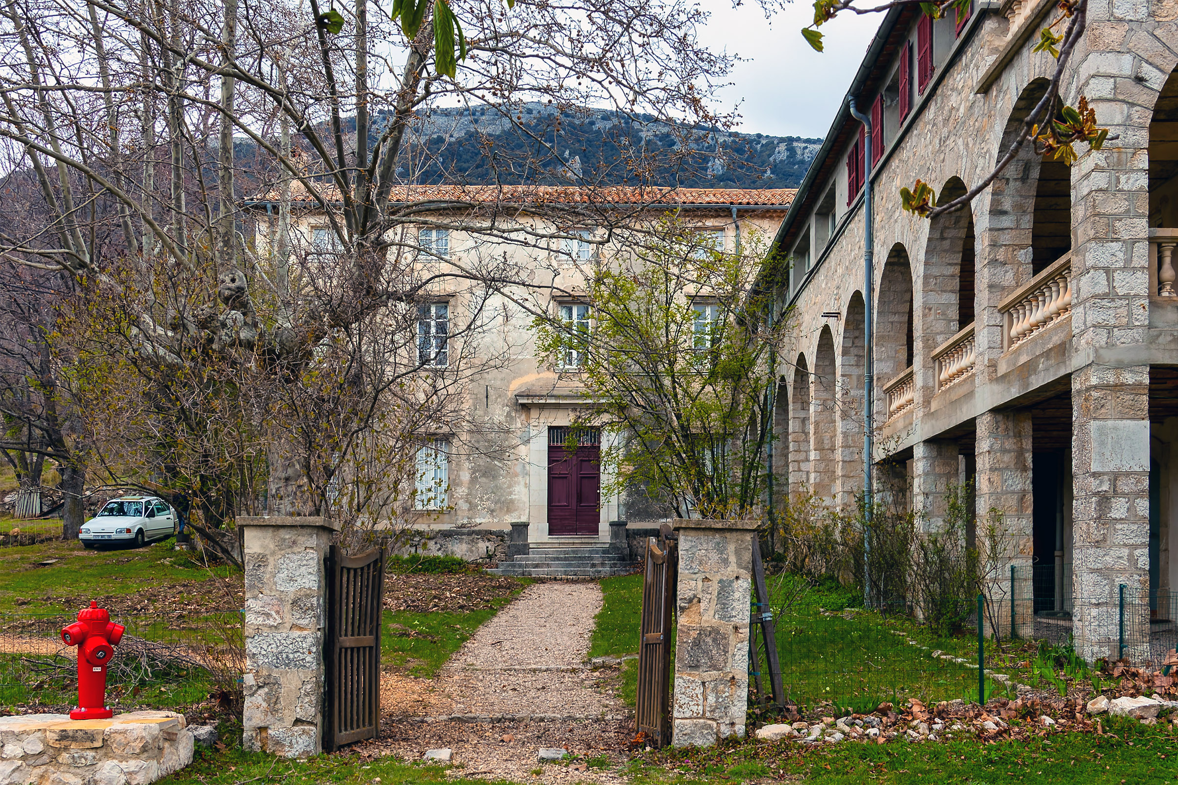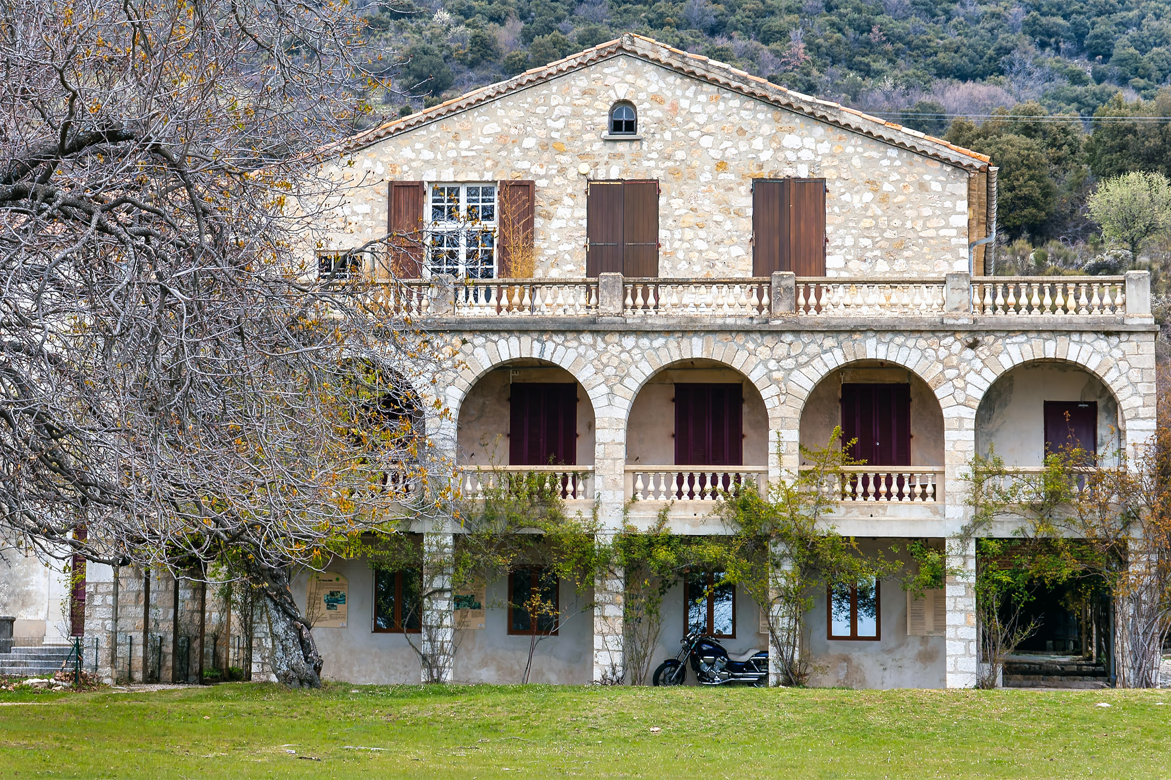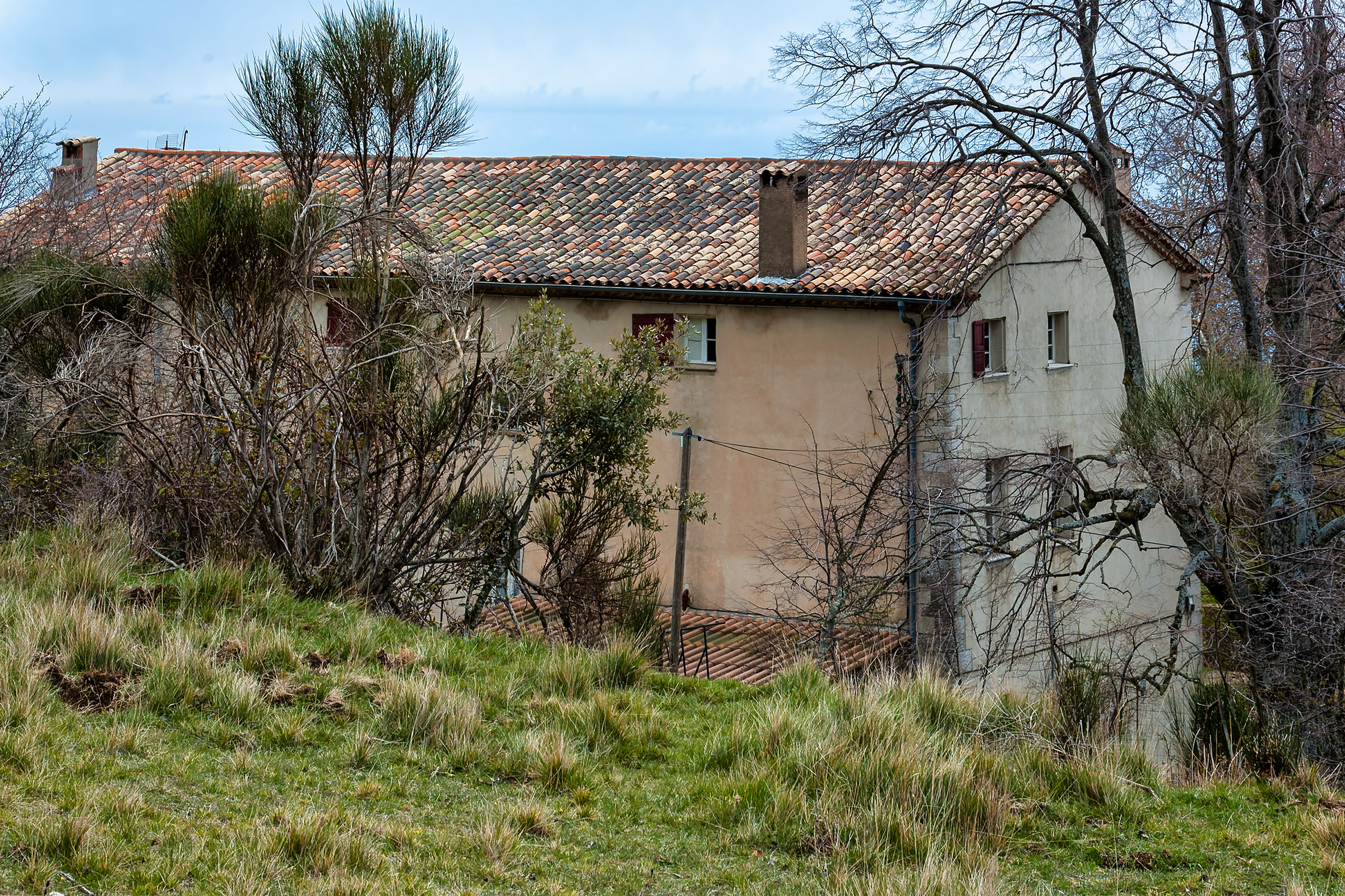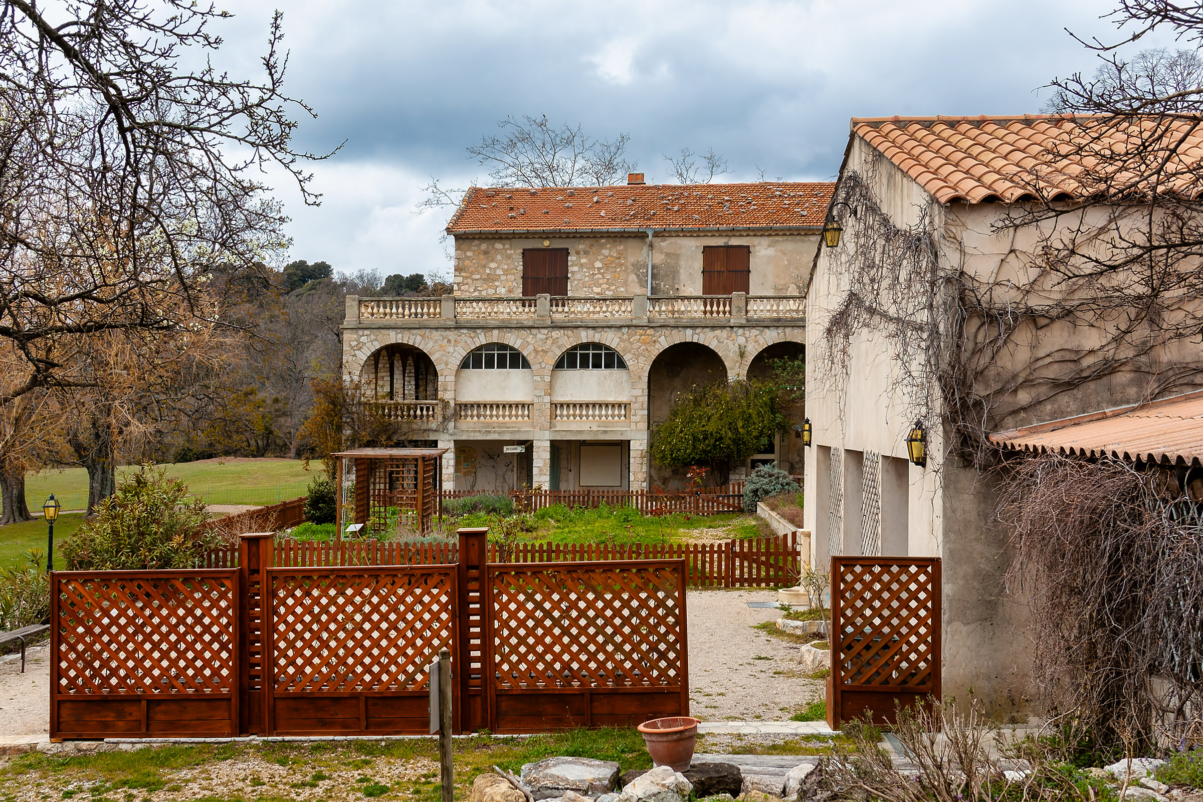 The Domaine de Courmettes was originally a sanatorium; it is located on land that is part of the village of Tourrettes-sur-Loup and belongs to the Association Amiral de Coligny. More recently, it has been used as a retreat, a conference center, and a vacation camp. At this time (April 2007) the complex is closed; several projects are being evaluated to see to what use the Domaine de Courmettes may be put in the future. Because the purpose of the Asociation Amiral de Coligny is to combat tuberculosis, it is not impossible that the domain will become associated with health care again. Another possibility is to make it a training center for environmentalists as the buildings are situated amid a nature preserve of some 600 hectares (roughly 1,500 acres). If I become aware of updates to this, I will post them in this space. The photos on this page were taken on Saturday, March 31, 2007 and reprocessed from the original raw files in November of 2015.