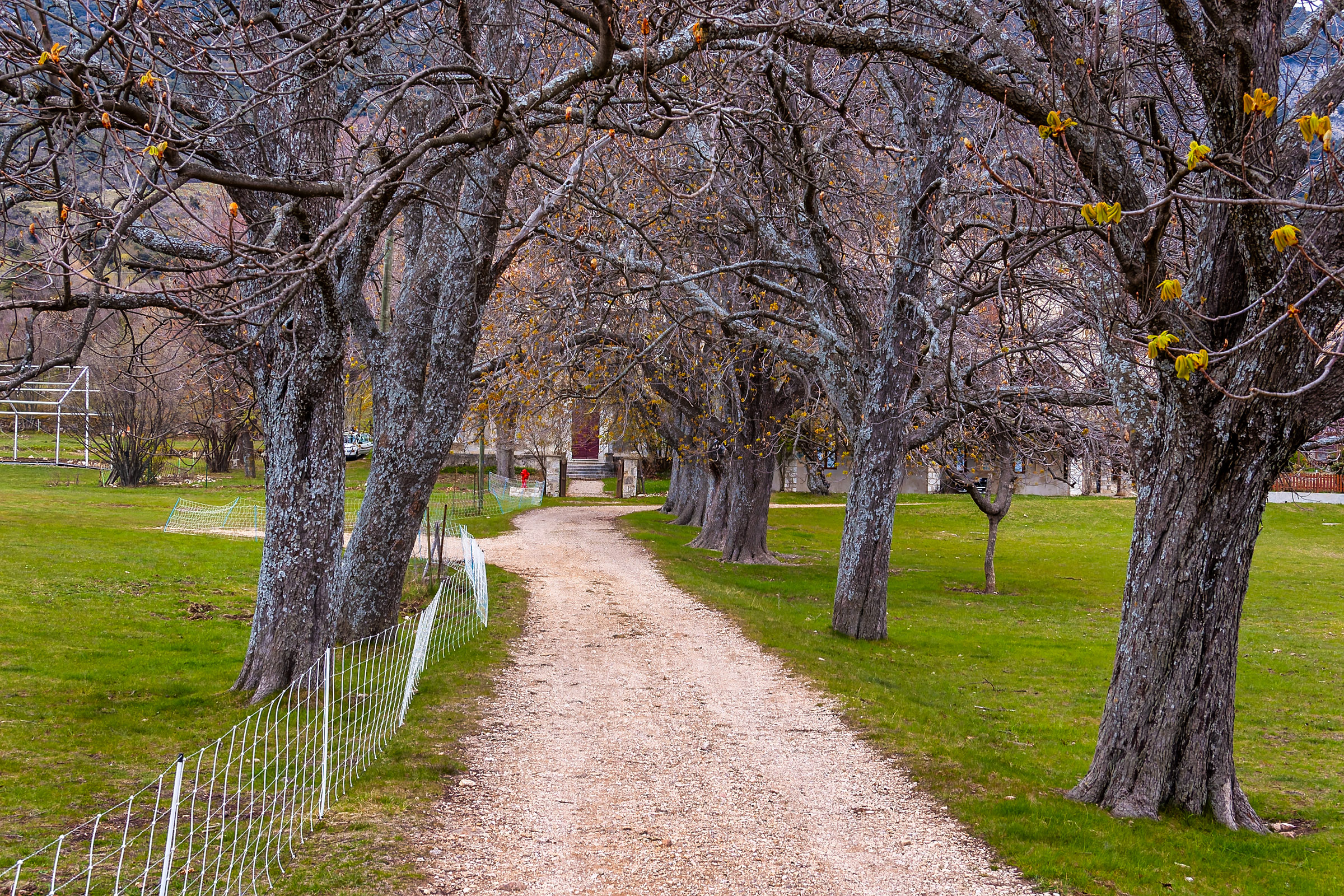 The tree-lined path to the building |