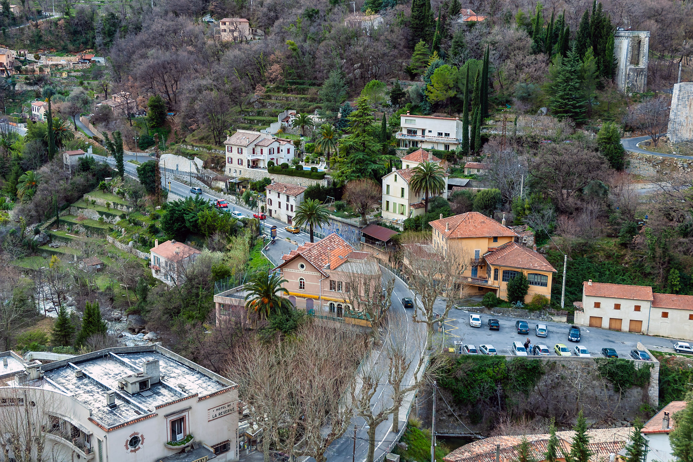Still, walking along a road quickly becomes tedious, especially since it is so steep that taking shortcuts by going straight down and bypassing the hairpin turns is not practical [33]. Getting lower, one can get a feel for just how high up Gourdon is perched [34]. Once one gets to the bottom, it takes a little over half an hour to reach Pont du Loup. For the last stretch, one walks on what used to be the old narrow-gauge railroad line [35]. It's fun to take the ten minute detour to walk through the old railway tunnel [36] that was seen previously from the aqueduct. From the other side of the tunnel, one overlooks the tiny village and the parking lot where the car is waiting [37]. Five minutes later, returning through the tunnel and down into the village, we are back where we started [38].