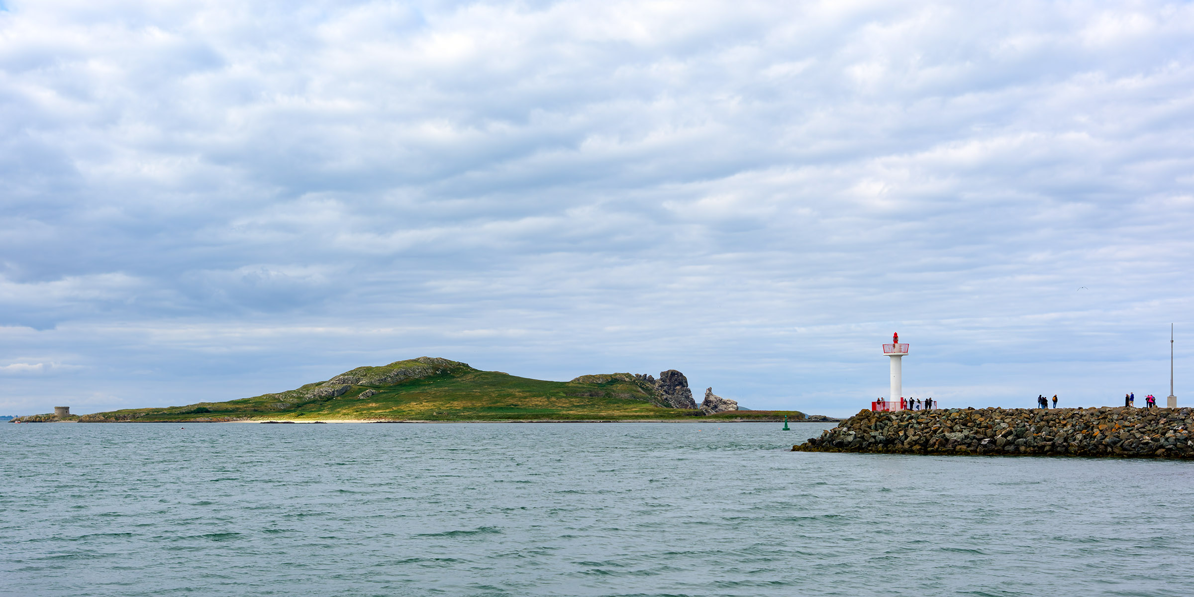 View from the end of the West Pier onto Ireland's Eye and the lighthouse at the end of the East Pier |
