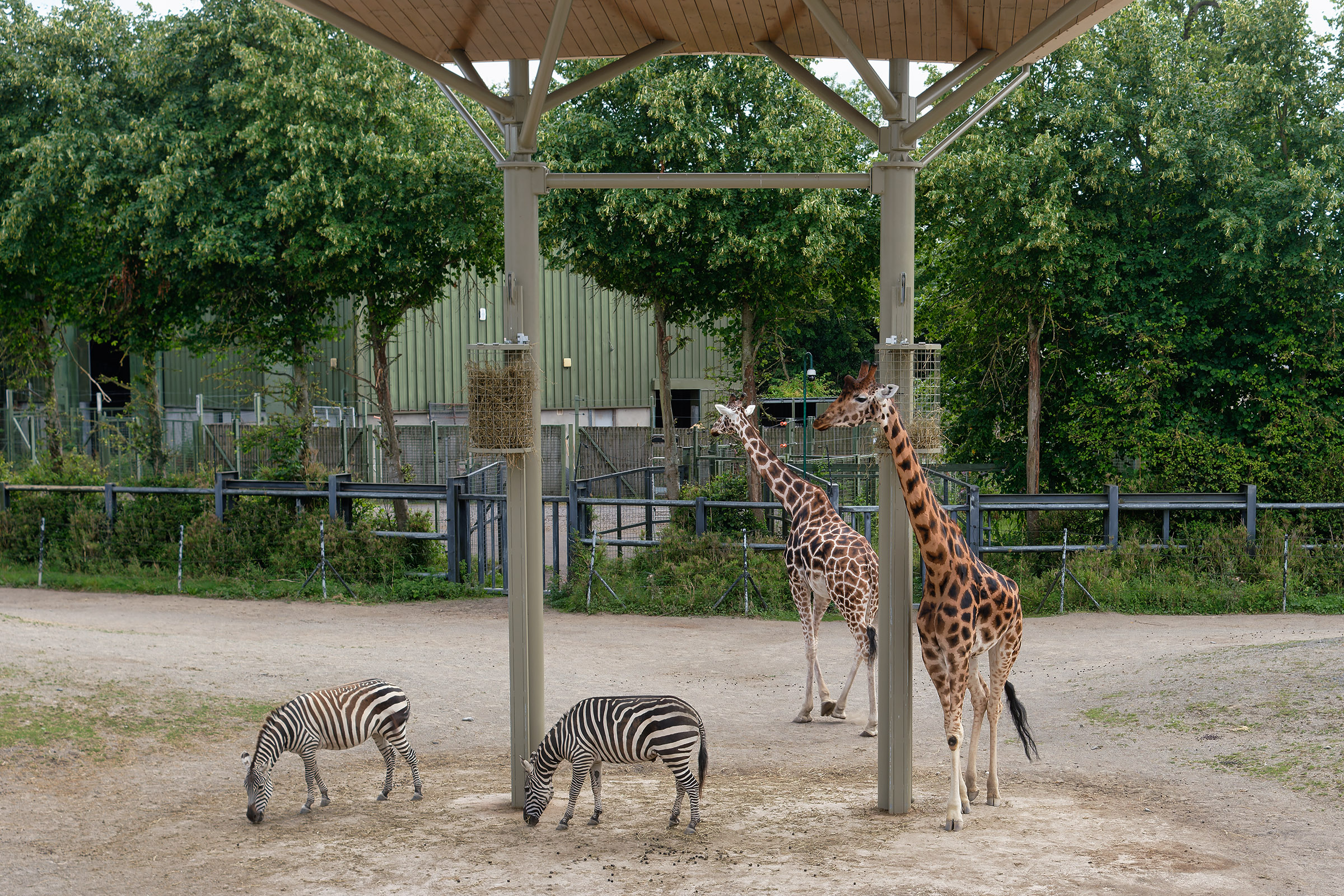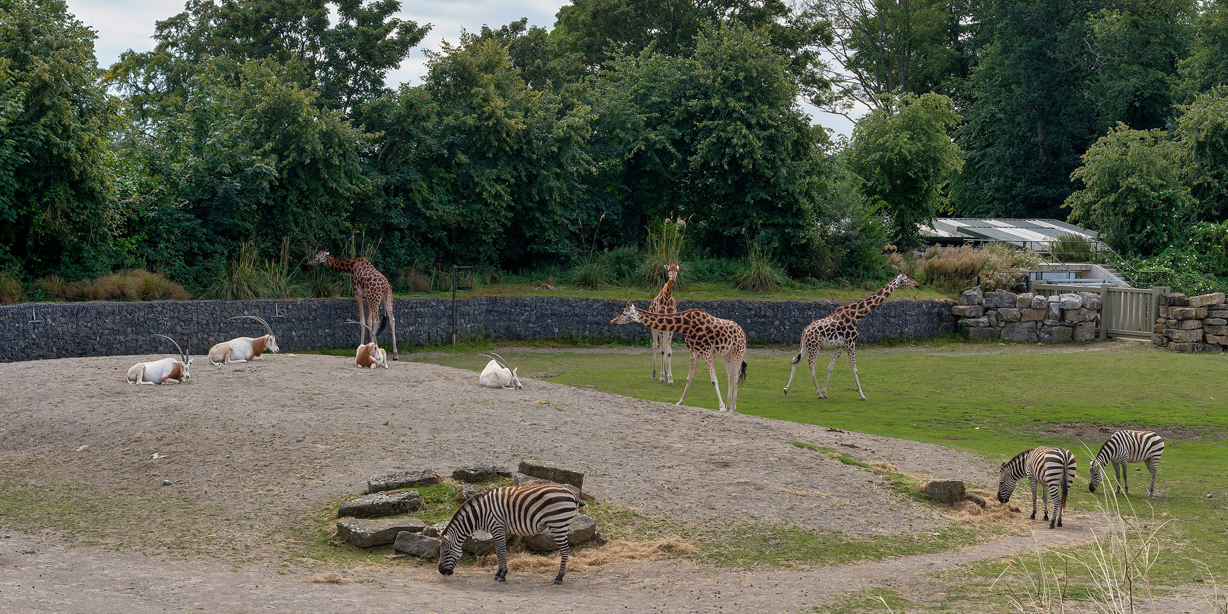 Scimitar oryx, Grant's zebras, and Rothschild's giraffes in the African Savanna part of Dublin Zoo |